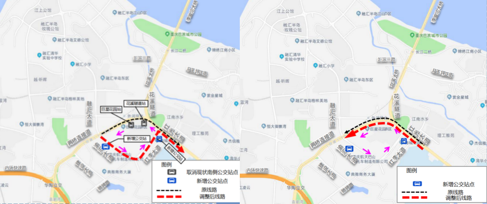 (去往花溪隧道方向)渝汇大道—红李大道—红光大道—花溪隧道,取消巨星花园站,新增渝汇大道站;返回融汇方向维持原线路走向和停靠站点。